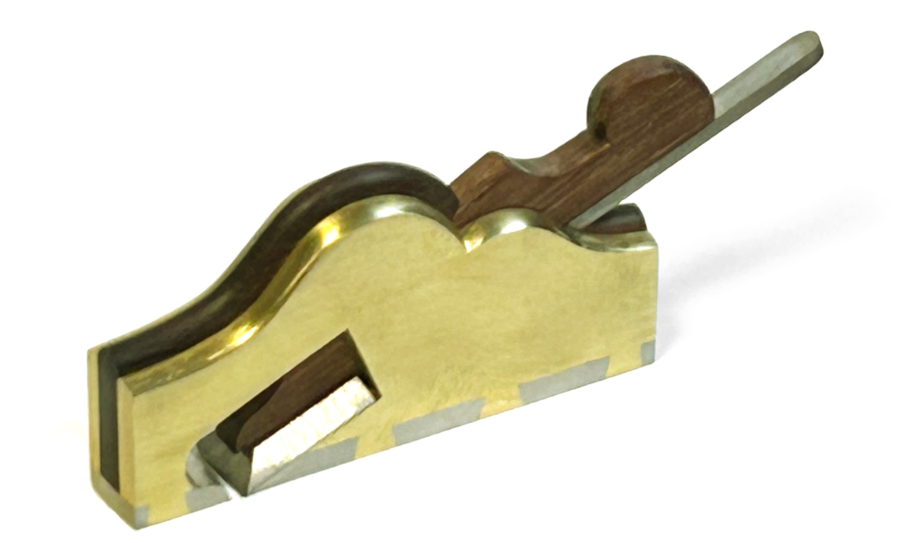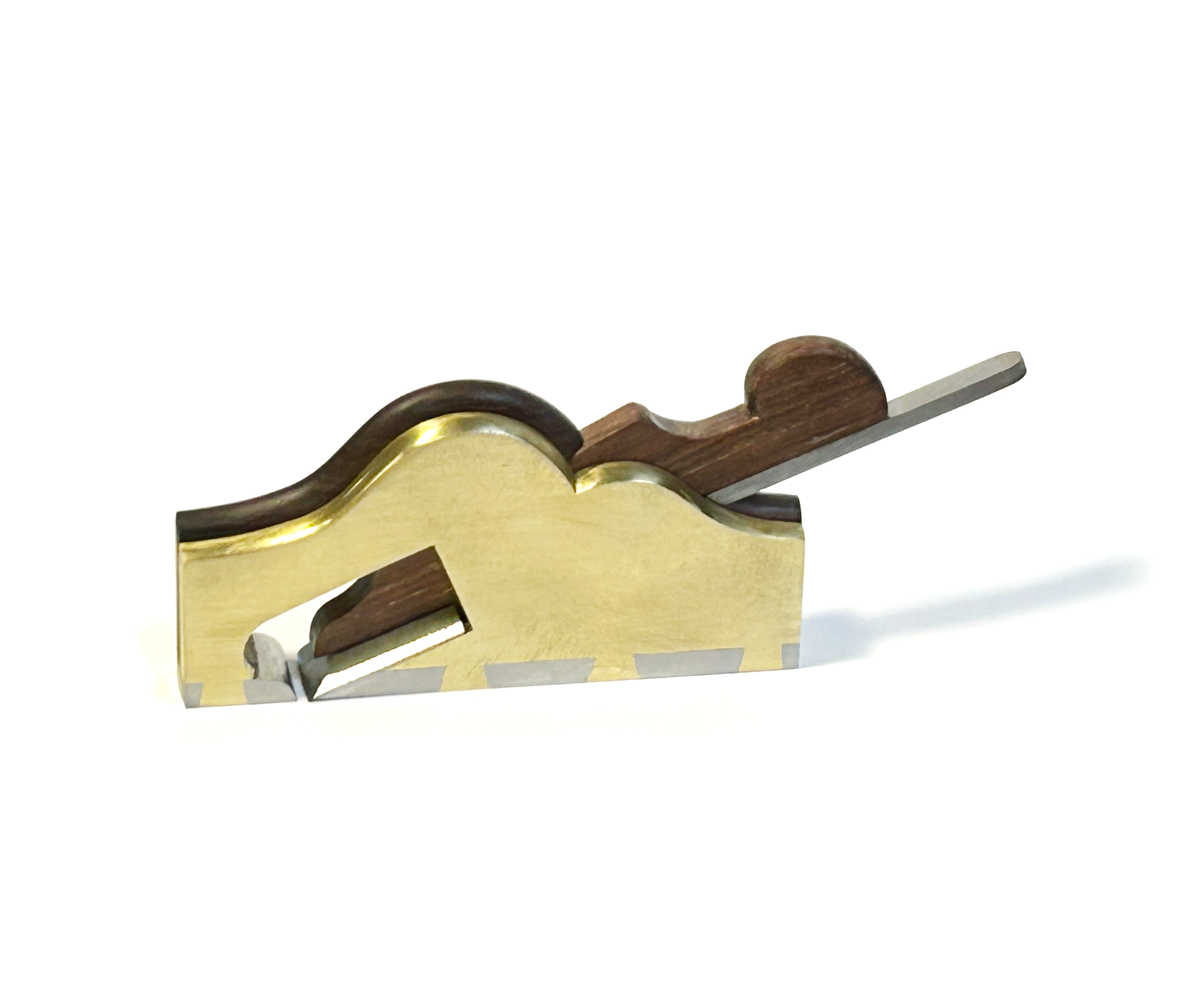 Compact rabbet plane with brass sides, steel sole, and rosewood stuffing.